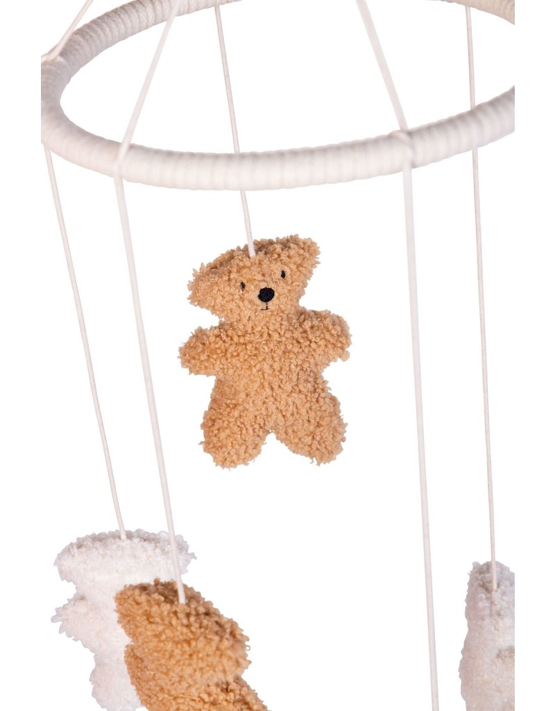 Deze zachte babymobiel bestaat uit 6 schattige figuurtjes in de kleuren teddy bruin en ecru. Je kleintje zal gefascineerd zijn door deze schattige dieren en zal er veel plezier mee beleven. De mobiel is ook handig om de bewegingsvaardigheden van je baby te stimuleren. Hij kan overal aan worden bevestigd door middel van een touwtje!