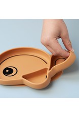 De afgeronde randen aan de binnenkant maken het gemakkelijker om voedsel op te scheppen met een lepel of vork. De zuignap houdt het bord op zijn plaats en helpt kleine eters hun eetkunsten te oefenen. Druk het bord naar beneden en het plakt aan de meeste gladde oppervlakken, zodat de kleintjes het niet kunnen kantelen of gooien. Een easy-release flap is verborgen onder de staart. Met drie vakken is dit bord ook perfect voor kieskeurige eters.