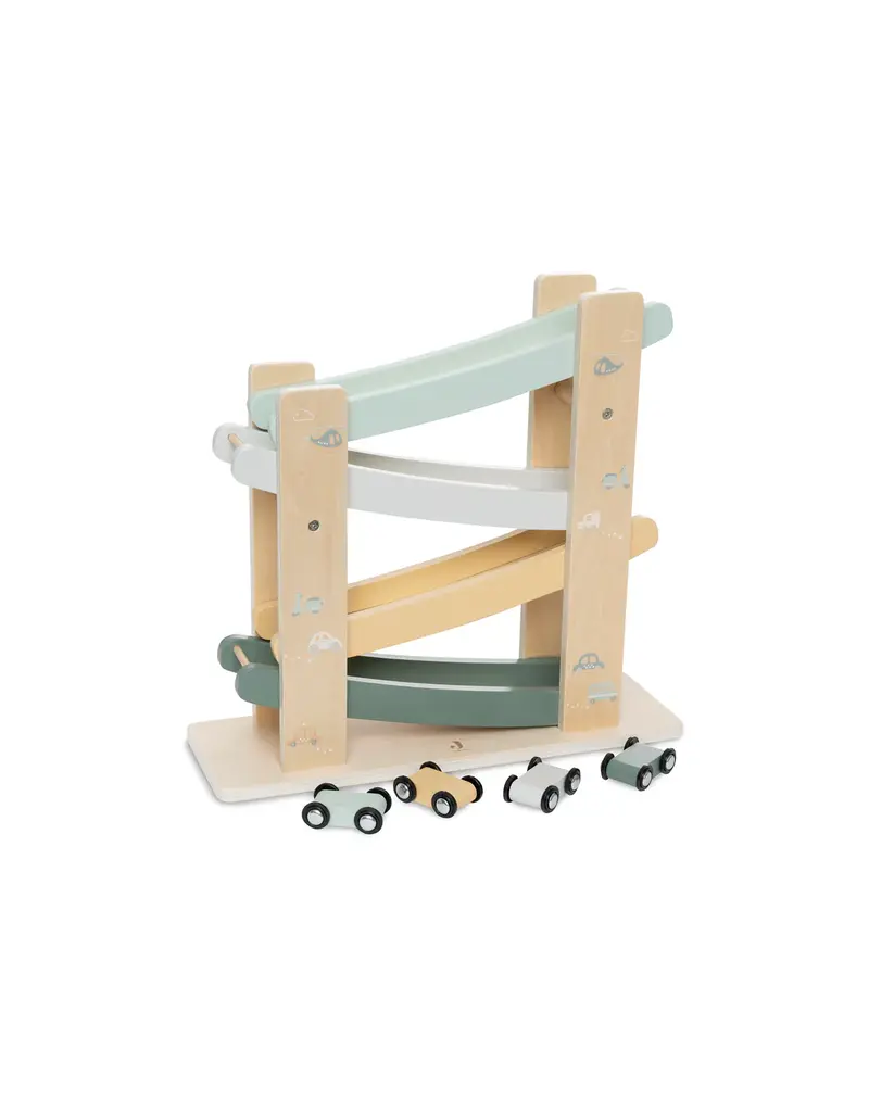Wauw! Maak je klaar voor eindeloos speelplezier met deze fantastische houten racebaan, perfect voor jouw kleine avonturier! Met vier vrolijke autootjes die over de baan racen, past deze set prachtig in ons "On the Go"-thema en houdt hij jouw mini (en vriendjes) bezig, van de eerste bocht tot de finishlijn! Deze racebaan is natuurlijk ook een perfect kraamcadeautje!