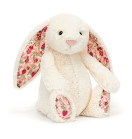 In de iconische crèmekleurige Bashful-vacht heeft Blossom Cream Bunny zachte katoenen oren en voeten, bedrukt met een origineel Jellycat-ontwerp van sappige aardbeien en crèmekleurige bloemen op een roze achtergrond.